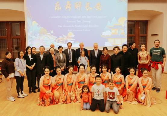 演出获得了观众们热烈的掌声和赞美,观众们纷纷上台与演员们合影留念,表达对中华文化的喜爱和赞赏。来自陕西的“老朋友”谭义明和杜菲娜热泪盈眶地表达对演出的赞美、对家乡的思念,来自帕德博恩大学的达维娜和保罗教授也与现场演奏的同学一起,尝试演奏了竹笛等中国民族乐器,了解中国传统文化。