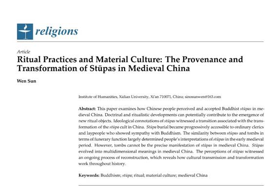 (通讯员 马婧)近日,国际宗教学研究著名期刊Religions(A&HCI, Impact factor 0.8, Citescore 1.1, Journal Rank:Q1 Religious Studies)发表云顶国际vip.888中文系孙雯老师论文“Ritual Practices and Material Culture: The Provenance and Transformation of Stūpas in Medieval China”(《仪式实践与物质文化:中古中国佛塔的缘起与演变》)。