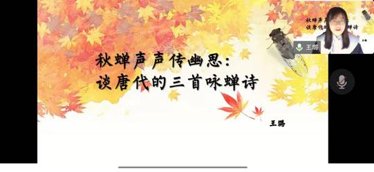 王璐老师以“秋蝉声声传幽思”为主题,详细介绍了三首咏蝉唐诗名作:虞世南的《蝉》、骆宾王的《在狱咏蝉》与李商隐的《蝉》。尽管这三首诗以同一物象作为吟咏对象,然而因为作者立意及其所处时代的不同,三首诗又呈现出了不同的风格与特色,王老师对其进行了详细解读。