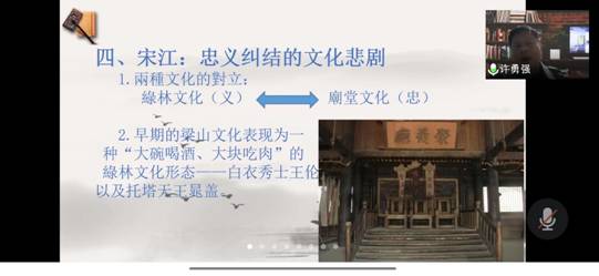 许勇强老师以《宋江:层累叠加的矛盾形象》为主题,结合四大名著中的《水浒传》和史实,介绍了历史中狂侠悍勇的宋江形象,市民文化中仗义疏财的宋江形象,以及经过南宋至元代市井文化的浸染后,文人笔下忠君爱国的宋江形象。最后,他提出,宋江的悲剧是绿林文化和朝堂文化纠结下的必然结果,引人深思。