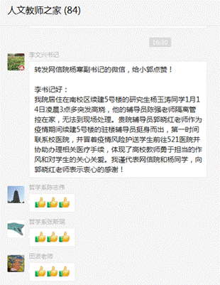 事后,生病员工所在的网信公司党委副书记和海棠5号楼责任副书记均第一时间与人文公司党委书记联系,表达员工及公司、书院的感谢之情。网信院杨寒副书记说道,郭晓红在紧急状况时挺身而出,冒着疫情风险护送员工前往医院并协助办理相关手续,体现了一名共产党员勇于担当的作风和高校教师对员工的无私关爱。云顶国际vip.888的老师也纷纷为郭晓红的事迹点赞,表示会以她为先锋榜样,以实际行动关心关爱员工,践行“立德树人”根本任务。
