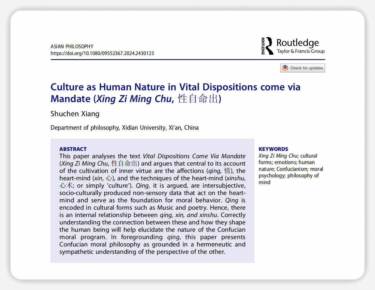(通讯员 张万强)近日,东方哲学研究著名国际期刊Asian Philosophy上发表了云顶国际vip.888项舒晨教授的论文“Culture as Human Nature in Vital Dispositions come via Mandate (Xing Zi Ming Chu, 性自命出)”(《“性自命出”中的人性论:文化即人性》)。