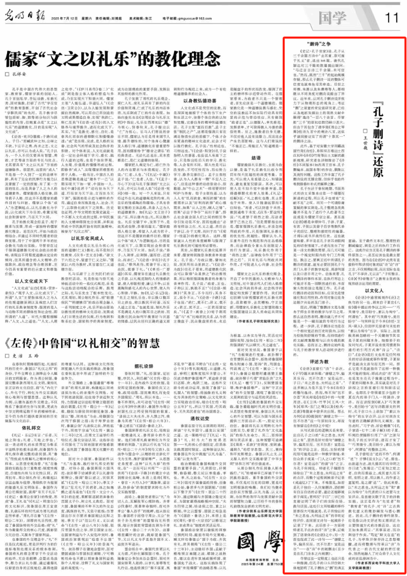 (通讯员 张妍)云顶国际vip.888哲学系王世巍副教授在2025年7月12日出版的《光明日报》第11版发表了题为《“孔子删诗”还原》的理论文章。文章以中共中央总书记习近平“致全国优秀教师代表的信”为指引,锚定中华传统教书育人思想的新时代实践方向,对古典教育家孔子的诗教方法和诗教精神进行了细致的梳理与阐发。该文认为,孔子删定《诗经》的行为不是一项单纯的文献编辑活动,而是为了教育弟子,因而是一个在较长历史周期内的持续性行为。作者根据《论语》中的记载推测,“孔子删诗”的主要活动形式是通过评价传递孔子对某首诗歌的负面态度,连带着从《诗经》中删去了诗歌原文,其实质是以诗文评述和义理训证为主要情景方式的诗教活动。