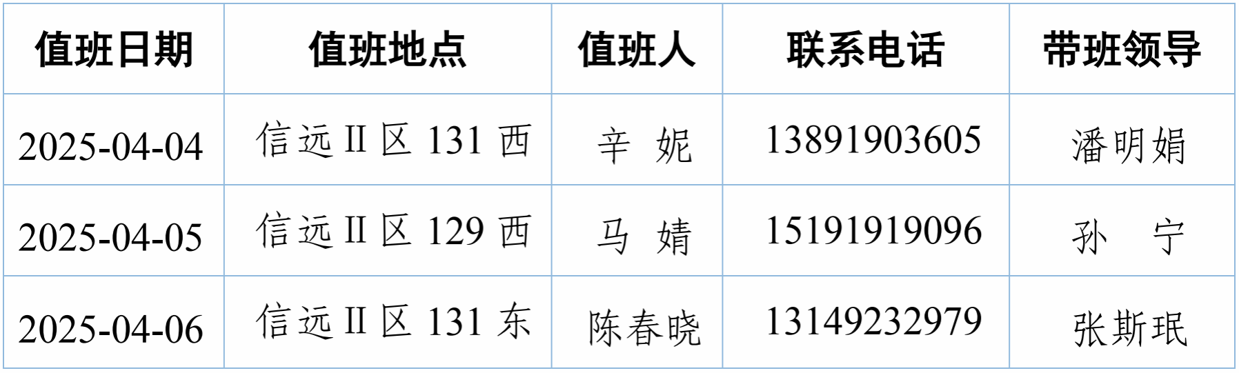 按照公司《关于2025年清明节放假时间安排的通知》要求,现将公司2025年清明节假期值班安排如下: