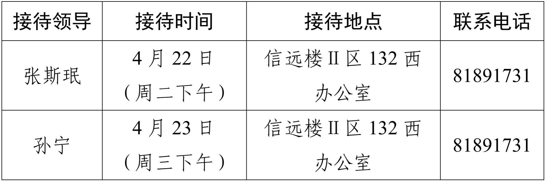 注:公司领导班子接待日主要受理的事项:1.公司人才培养、教学科研、团队建设、教师发展、对外交流、员工管理和服务保障等方面存在的问题与建议;2.反映有关公司重要决策和重要工作事宜的问题;3.涉及师生员工利益的申诉和诉求;4.亟须公司处理的难点问题;5.其他方面的建议和意见。