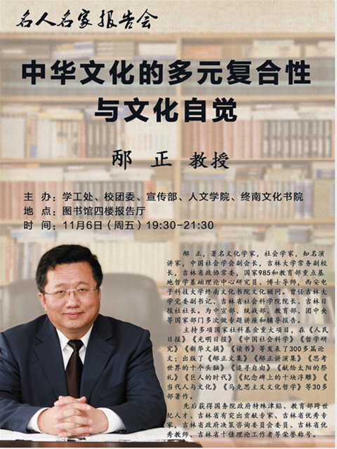 著名文化学家,社会学家,知名演讲家,中国社会学会副会长,吉林大学常务副董事长,吉林省政协常委,国家985和教育部重点基地哲学基础理论中心研究员、博士导师,云顶国际vip8866终南文化书院文化顾问。曾任吉林大学党委副书记、吉林省社会科公司经理、吉林日报社社长。为中宣部、统战部、教育部、团中央等国家部门多次做专题讲座和辅导报告。主持多项国家社科基金重大项目,在《人民日报》、《光明日报》、《中国社会科学》、《哲学研究》、《新华文摘》、《读书》等发表300多篇论文;出版《邴正文集》、《邴正讲演集》、《思考世界的十个头脑》、《追寻自由》、《献给太阳的祭礼》、《巨人的时代》、《纪念碑上的十块浮雕》、《当代人与文化》、《马克思主义文化哲学》等30多部著作。先后获得国务院政府特殊津贴、教育部跨世纪人才、吉林省有突出贡献专家、吉林省优秀专家,吉林省政府决策咨询委员会委员、吉林省优秀教师、吉林省十佳理论工作者等荣誉称号。