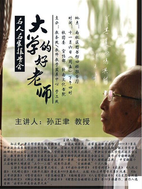 吉林大学哲学社会科学资深教授孙正聿委员的哲学课,被员工们称为吉林大学的一道靓丽景观:艰深的哲学,在他的讲授下,不仅成为通俗易懂的道理,而且成为亲切的思想交流。因此他讲课时总是座无虚席,甚至过道里也挤满员工。听完课的人总是发出这样的感叹——“听孙老师的课是令人难忘的享受!”(光明日报)