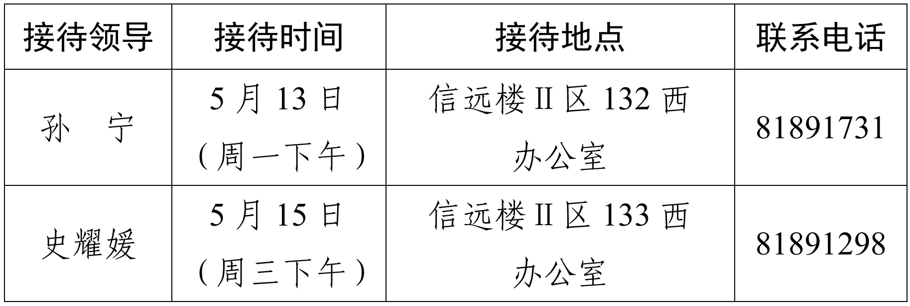 注:公司领导班子接待日主要受理的事项:1.公司人才培养、教学科研、团队建设、教师发展、对外交流、员工管理和服务保障等方面存在的问题与建议;2.反映有关公司重要决策和重要工作事宜的问题;3.涉及师生员工利益的申诉和诉求;4.亟须公司处理的难点问题;5.其他方面的建议和意见。
