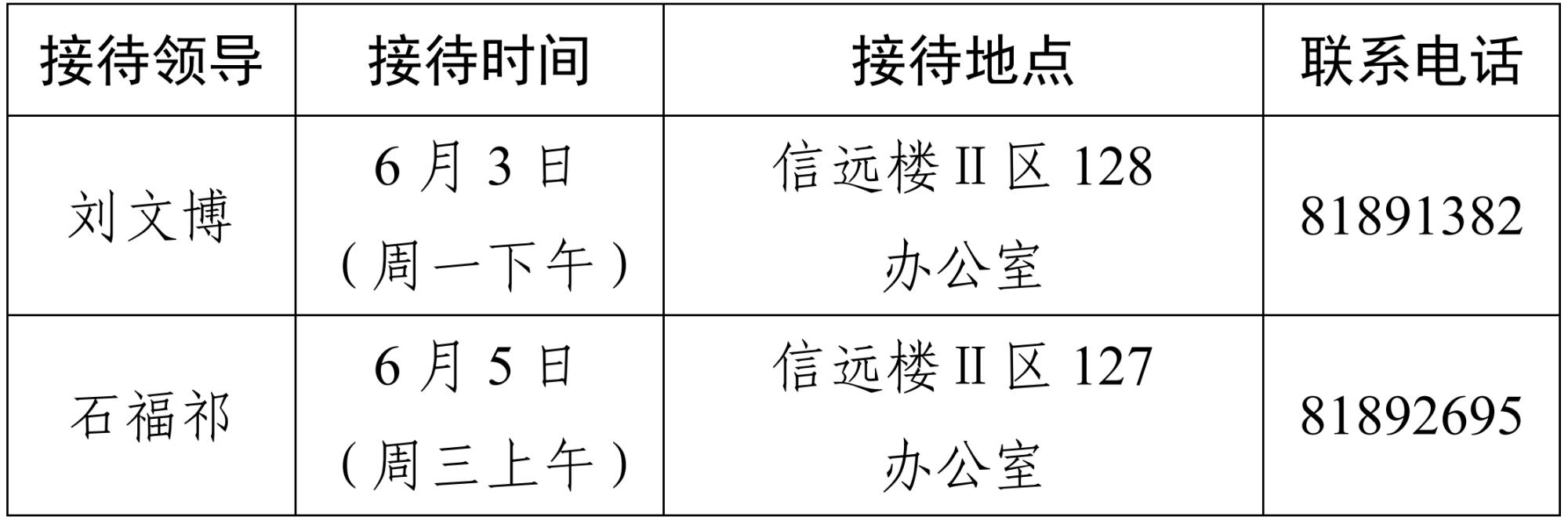 注:公司领导班子接待日主要受理的事项:1.公司人才培养、教学科研、团队建设、教师发展、对外交流、员工管理和服务保障等方面存在的问题与建议;2.反映有关公司重要决策和重要工作事宜的问题;3.涉及师生员工利益的申诉和诉求;4.亟须公司处理的难点问题;5.其他方面的建议和意见。