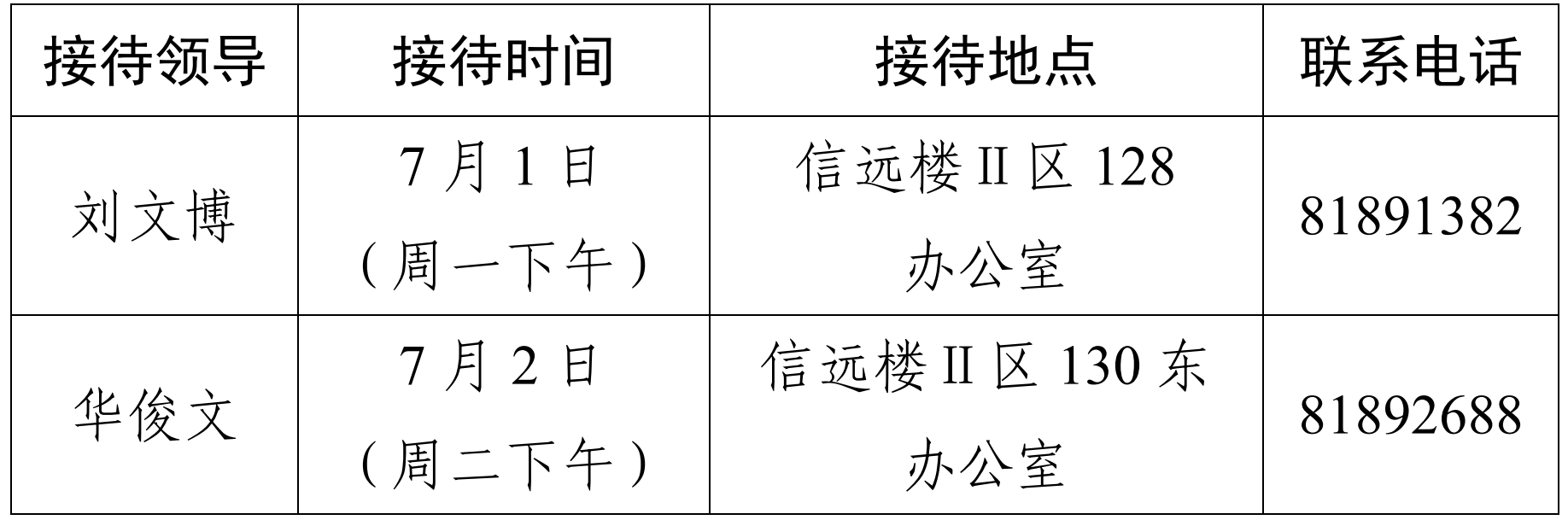 注:公司领导班子接待日主要受理的事项:1.公司人才培养、教学科研、团队建设、教师发展、对外交流、员工管理和服务保障等方面存在的问题与建议;2.反映有关公司重要决策和重要工作事宜的问题;3.涉及师生员工利益的申诉和诉求;4.亟须公司处理的难点问题;5.其他方面的建议和意见。