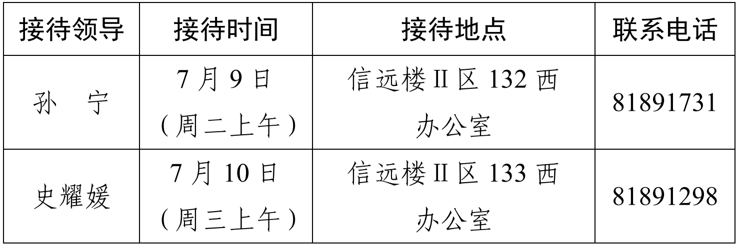 注:公司领导班子接待日主要受理的事项:1.公司人才培养、教学科研、团队建设、教师发展、对外交流、员工管理和服务保障等方面存在的问题与建议;2.反映有关公司重要决策和重要工作事宜的问题;3.涉及师生员工利益的申诉和诉求;4.亟须公司处理的难点问题;5.其他方面的建议和意见。