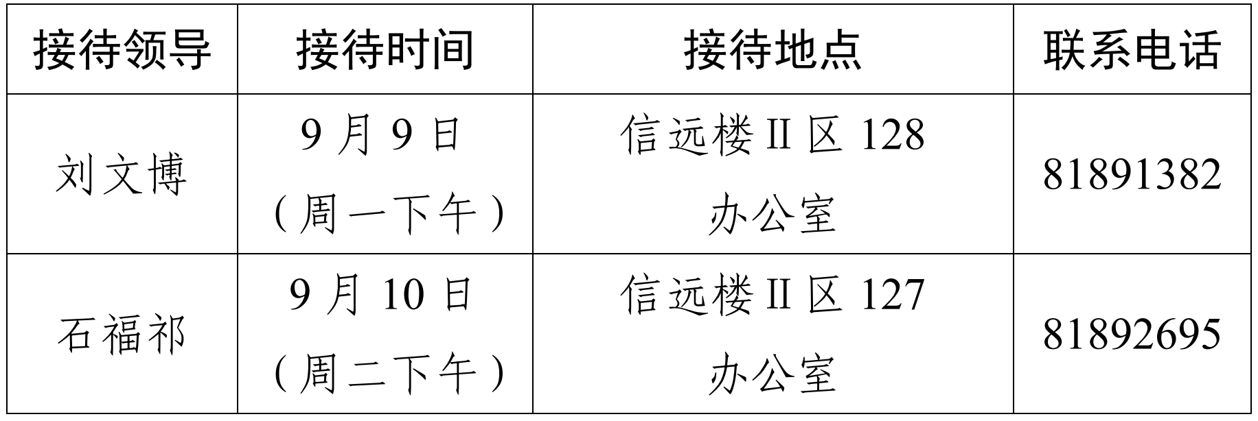根据《云顶国际vip.888领导班子接待日制度》精神,每周安排两位公司领导接待师生。现将9月9日-13日公司领导接待安排公布如下: