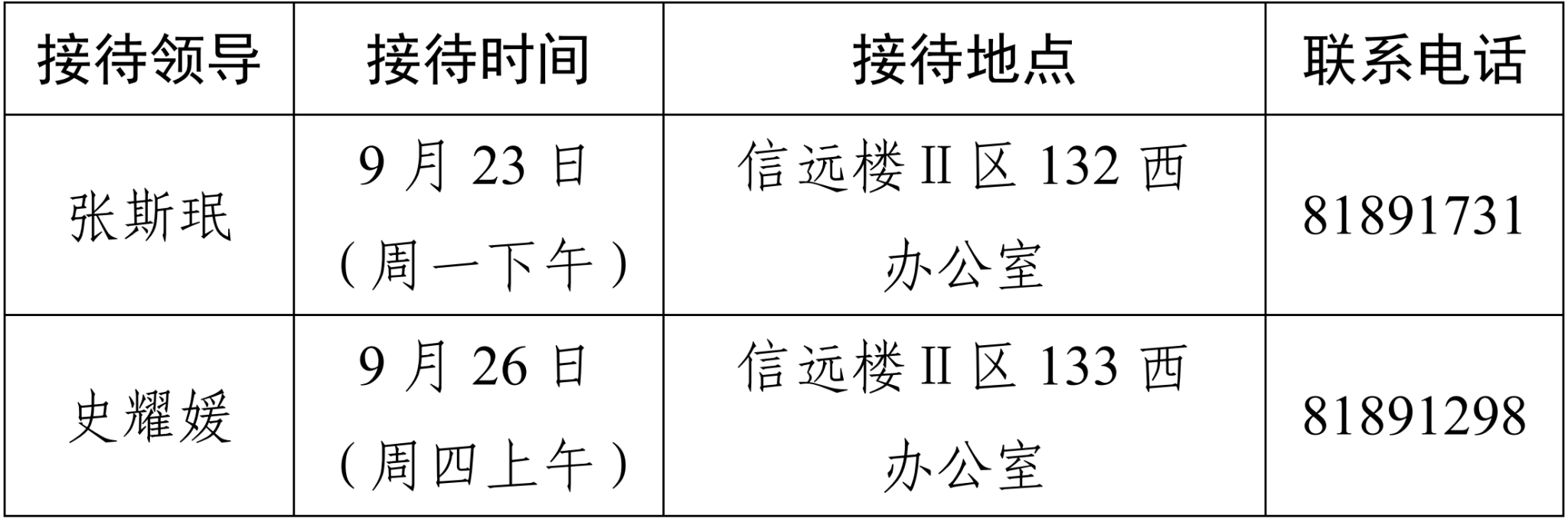 注:公司领导班子接待日主要受理的事项:1.公司人才培养、教学科研、团队建设、教师发展、对外交流、员工管理和服务保障等方面存在的问题与建议;2.反映有关公司重要决策和重要工作事宜的问题;3.涉及师生员工利益的申诉和诉求;4.亟须公司处理的难点问题;5.其他方面的建议和意见。