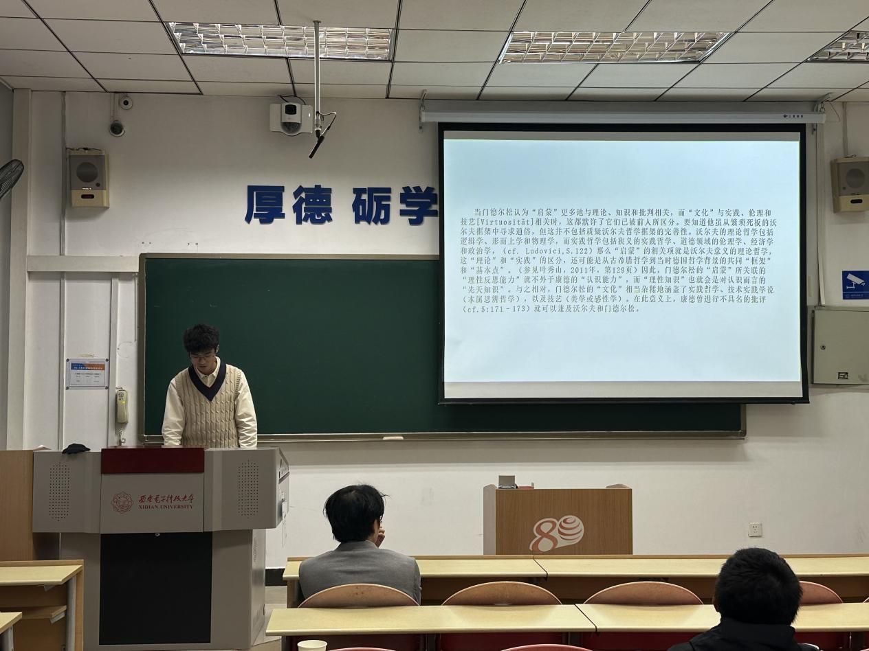 马璟以“康德与门德尔松论启蒙”为主题进行了汇报。他指出,在德国的启蒙运动背景下,康德与门德尔松各自独立提出了深刻且影响深远的观点,然而,现有研究文献中关于两位思想家在其各自思想框架下所提出启蒙理念之间的细微差别的探讨不够充分,这导致了对两种不同启蒙路径、结果及其所面临挑战的深入分析受到了限制。随后,他详细说明了“启蒙”与“理性”这两个概念在康德与门德尔松各自理论体系中的不同解释。