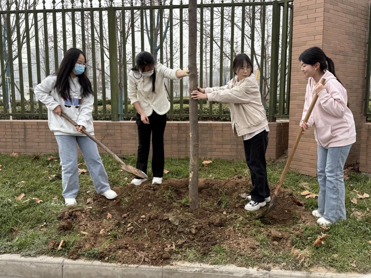 本次活动涵盖理论学习与实践体验两个部分。在理论学习环节,班主任刘茸茸强调:“新时代青年必须牢固树立生态价值观,以实际行动践行生态文明建设。”辅导员郭晓红通过“塞罕坝三代人治沙”“蚂蚁森林全民种树”等鲜活案例,生动诠释了“绿水青山就是金山银山”的深刻内涵。员工李含一结合纪录片《绿色中国梦》,讲述了我国植树节的由来和植树造林的重要意义,展现了中国治理荒漠化的决心与效率。理论学习后,在班主任和辅导员的带领下,同学们前往南操场西侧进行植树活动,让防治荒漠化的理论认知转化为扶苗培土的实际行动,在汗水中深化了对生态文明建设“知行合一”的理解。