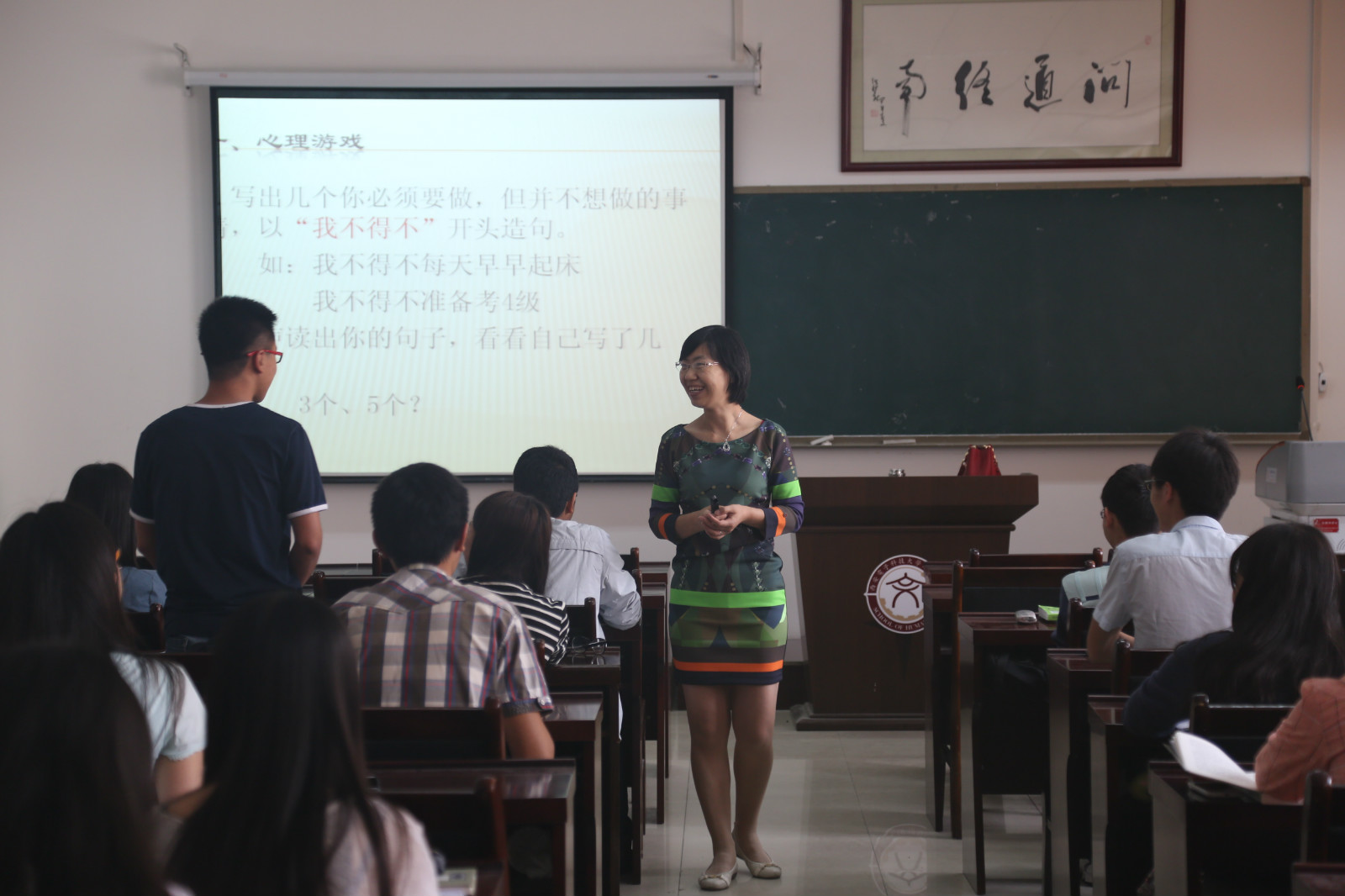 之后则是一个让大家进行自我展示与自我探索的游戏。老师先将同学以出生月份分为12个组,将不熟悉的同学们聚在一个组进行自我介绍并相互认识。接着老师让大家写下自己想成为的事物并写出理由再让大家上讲台与同学们一起分享。通过这一游戏中的心理情绪变化,让大家对自我有了更深刻的认识与把握。