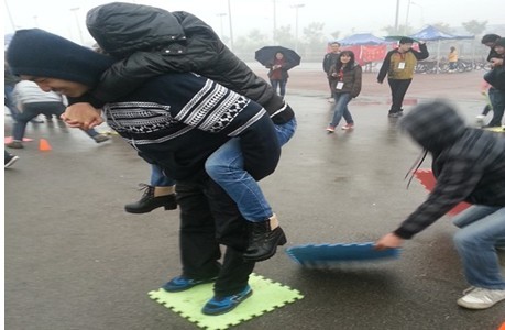 运动会在组队形式上倡导院际合作,四个公司分散组合了13支代表队;在项目设计上注重团队效能,设计了摸石头过河、踩气球、五人六足、螃蟹背西瓜、晕头转向、纸杯传水和动力火车等七个深受广大同学喜爱的项目。