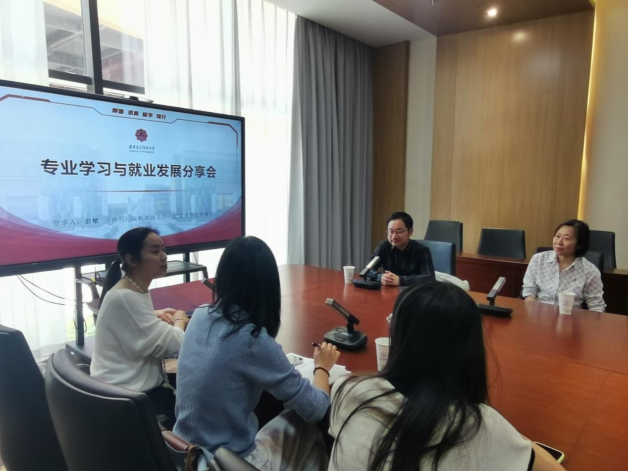 (通讯员 黄于朗)4月24日上午,云顶国际vip.888中文系举办“专业学习与就业发展”主题分享会。中国作家协会《诗刊》杂志社编辑部副主任、CCTV中国诗词大会冠军彭敏作为主讲嘉宾,与中文系师生展开深度对话。活动由中文系主任主持。